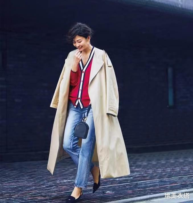 高纯的鲜艳红色毛衣,有巧妙的白黑镶边,下配牛仔裤,外披长风衣,堪称卡其风衣的绝配。撞色之彩,对比之丰富,让穿搭成为一首诗,一幅画。