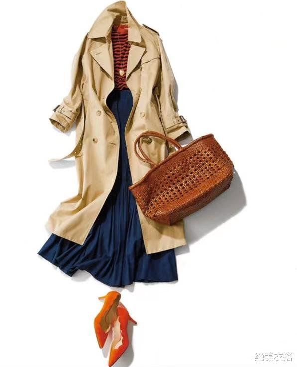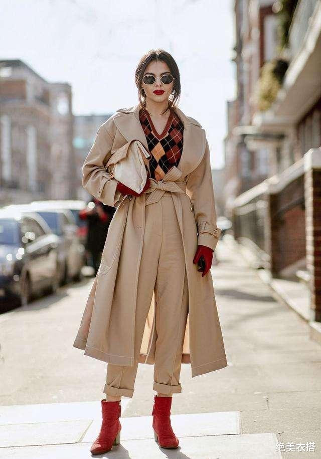 以卡其风衣为例,它的最契合搭档,就是以红、蓝为代表的鲜艳色。