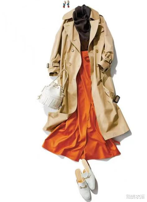 卡其色风衣+橙色半裙,内搭用深棕色衔接,如此一来,配色的一气呵成与风格的惊艳,交织融合为一首赞曲。